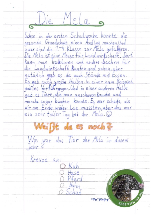 Ein spannender Ausflug erwartete die Klassen 1–4: Dank der Unterstützung der Lippold-Stiftung konnten die Schülerinnen und Schüler die Mela besuchen und viele Eindrücke rund um Landwirtschaft, Tiere und Vorführungen sammeln. Der folgende Bericht erzählt mehr darüber.